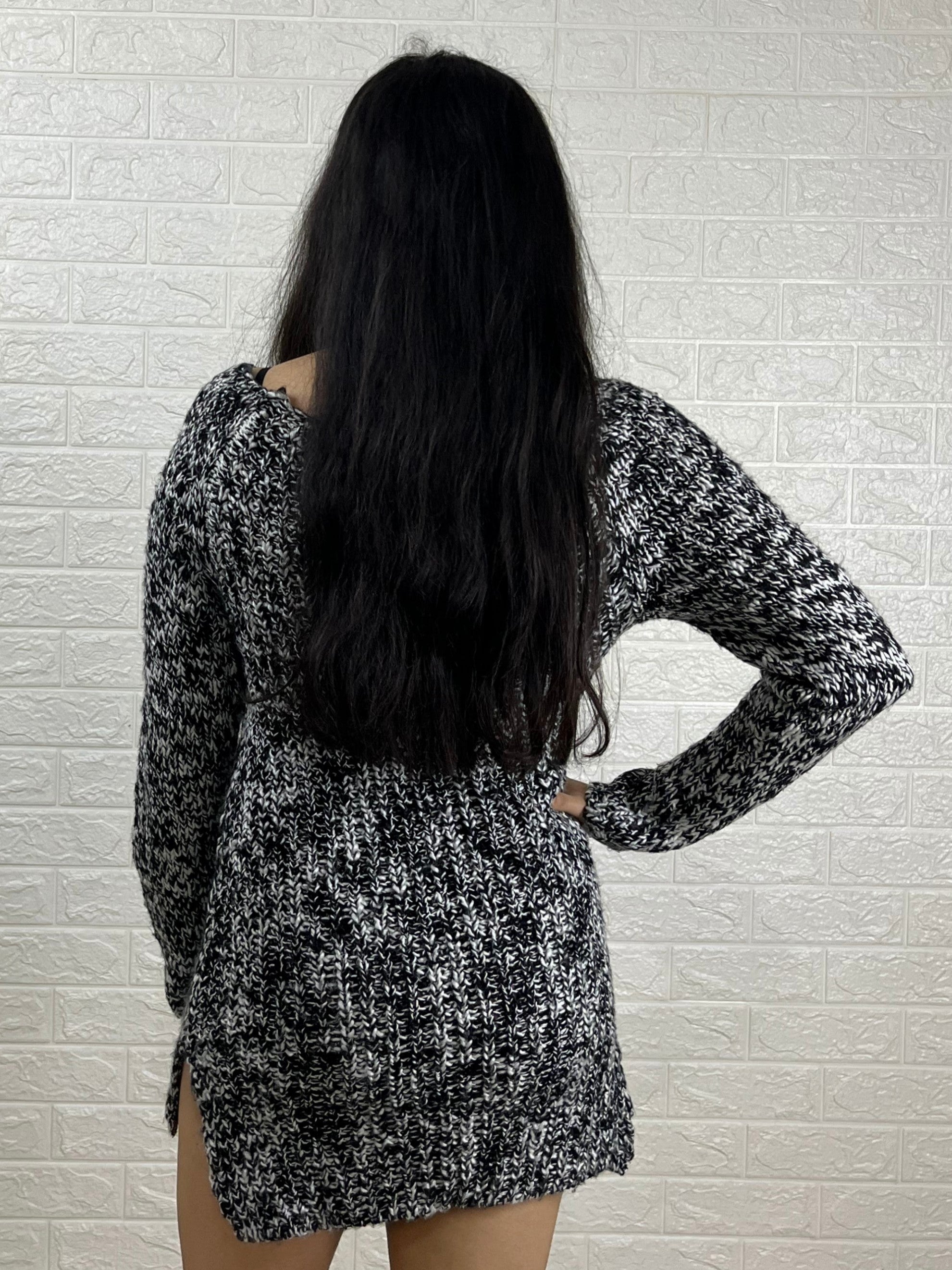 Wrap yourself in monochrome style with our Marled Knit Tunic. This effortlessly chic piece is designed to be worn as a long sweater over leggings or as a mini sweater dress. The striking black and white marled yarn adds rich texture, making it a perfect standout staple for your cold-weather wardrobe.