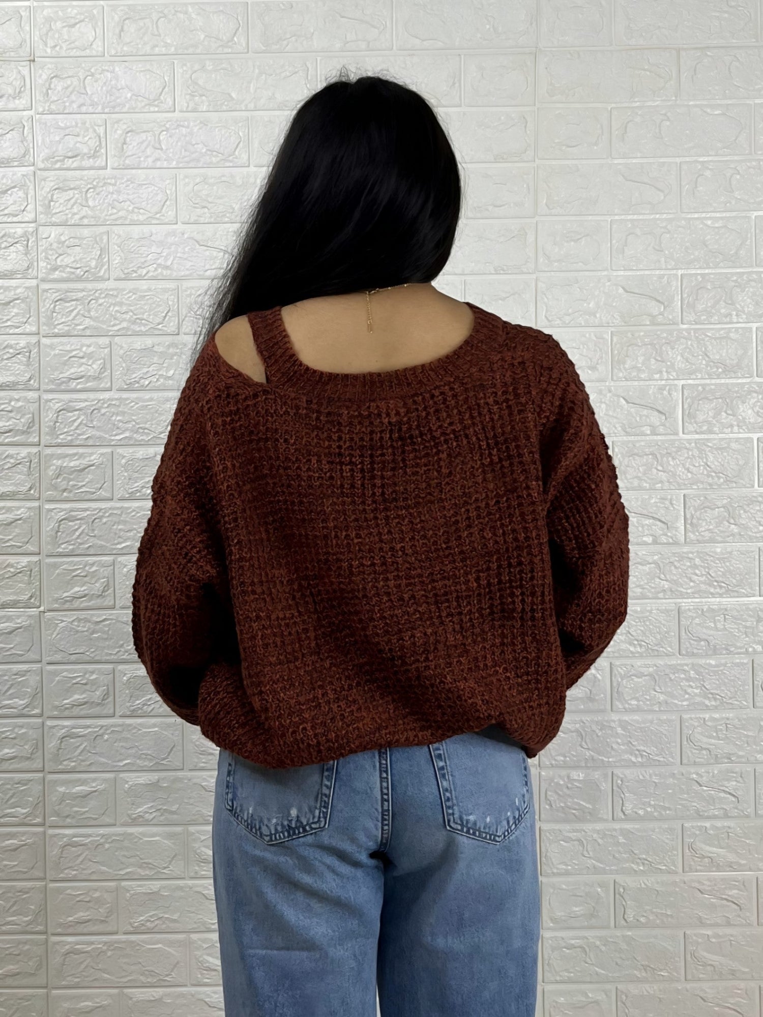 Add rich, earthy color and modern flair to your wardrobe with our Rust Cold Shoulder Sweater. This cozy piece features an inviting textured knit and a flattering asymmetric neckline, making it the perfect statement pullover for elevated casual style.