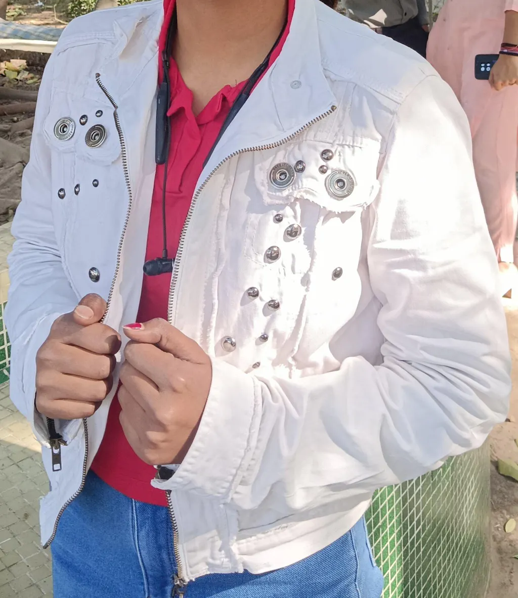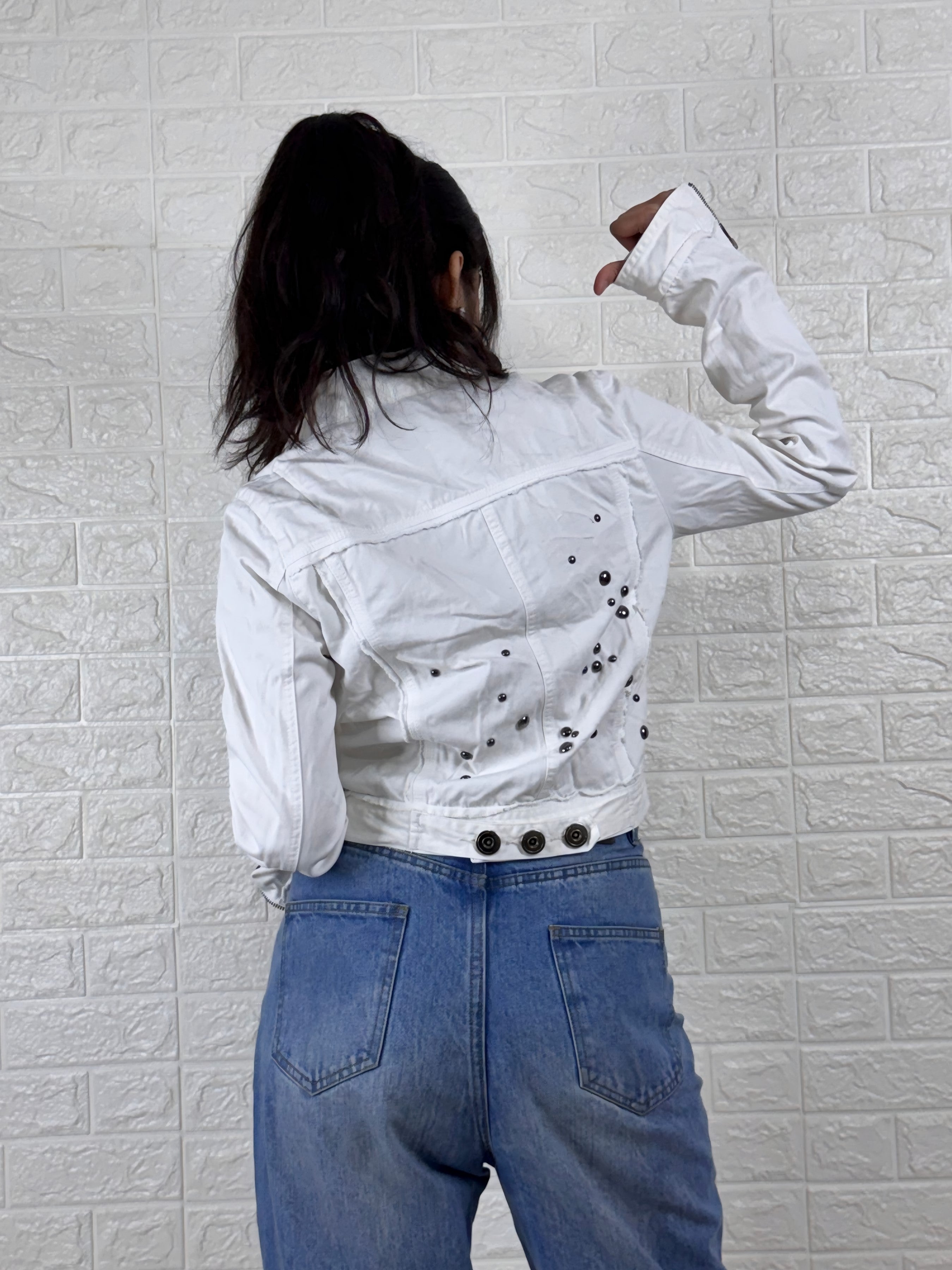 Make a bold style statement with this white embellished crop jacket, featuring metallic stud detailing that adds a sharp, modern edge. Designed with a structured silhouette and a sleek front zipper, it blends casual comfort with chic streetwear energy.