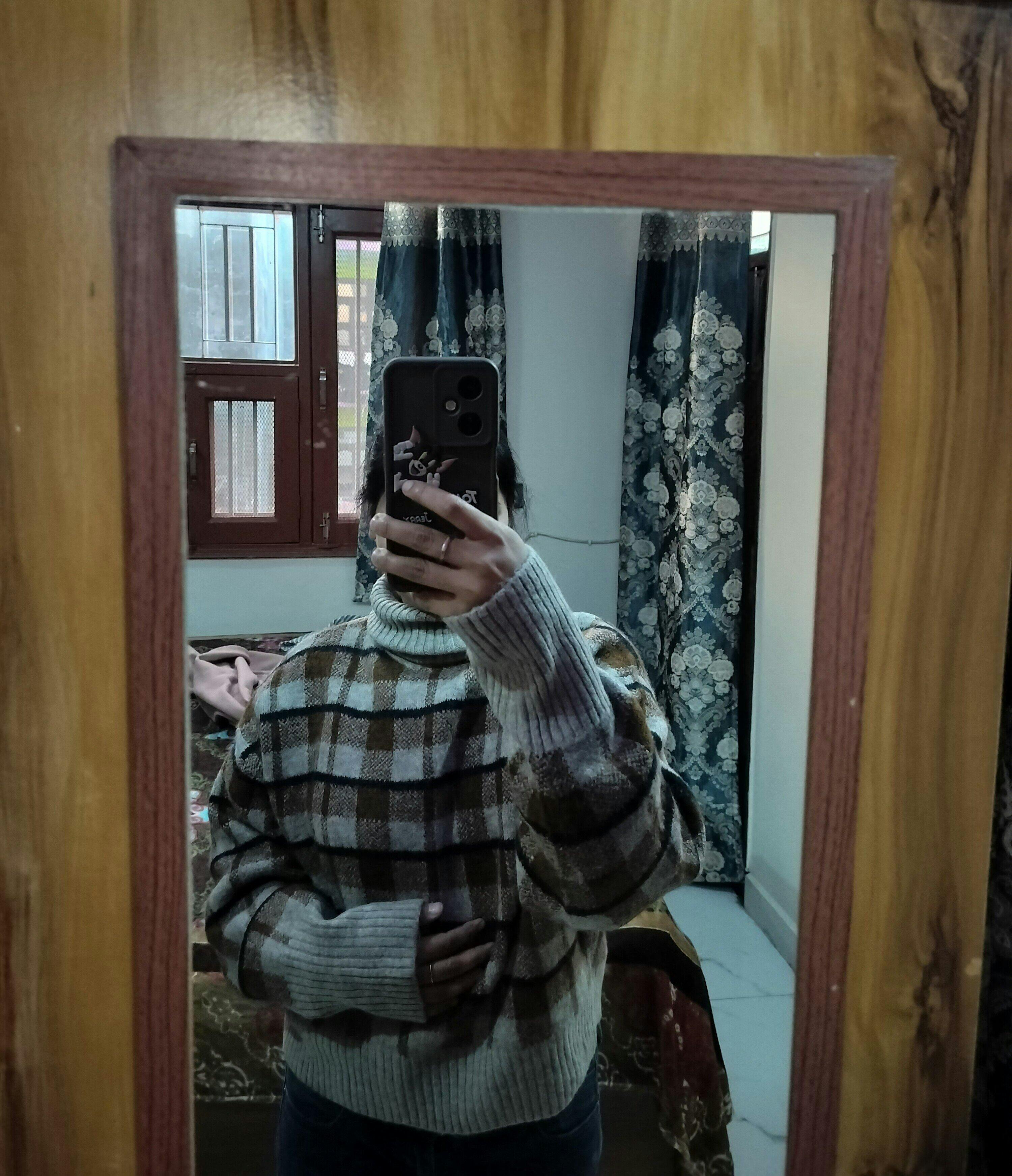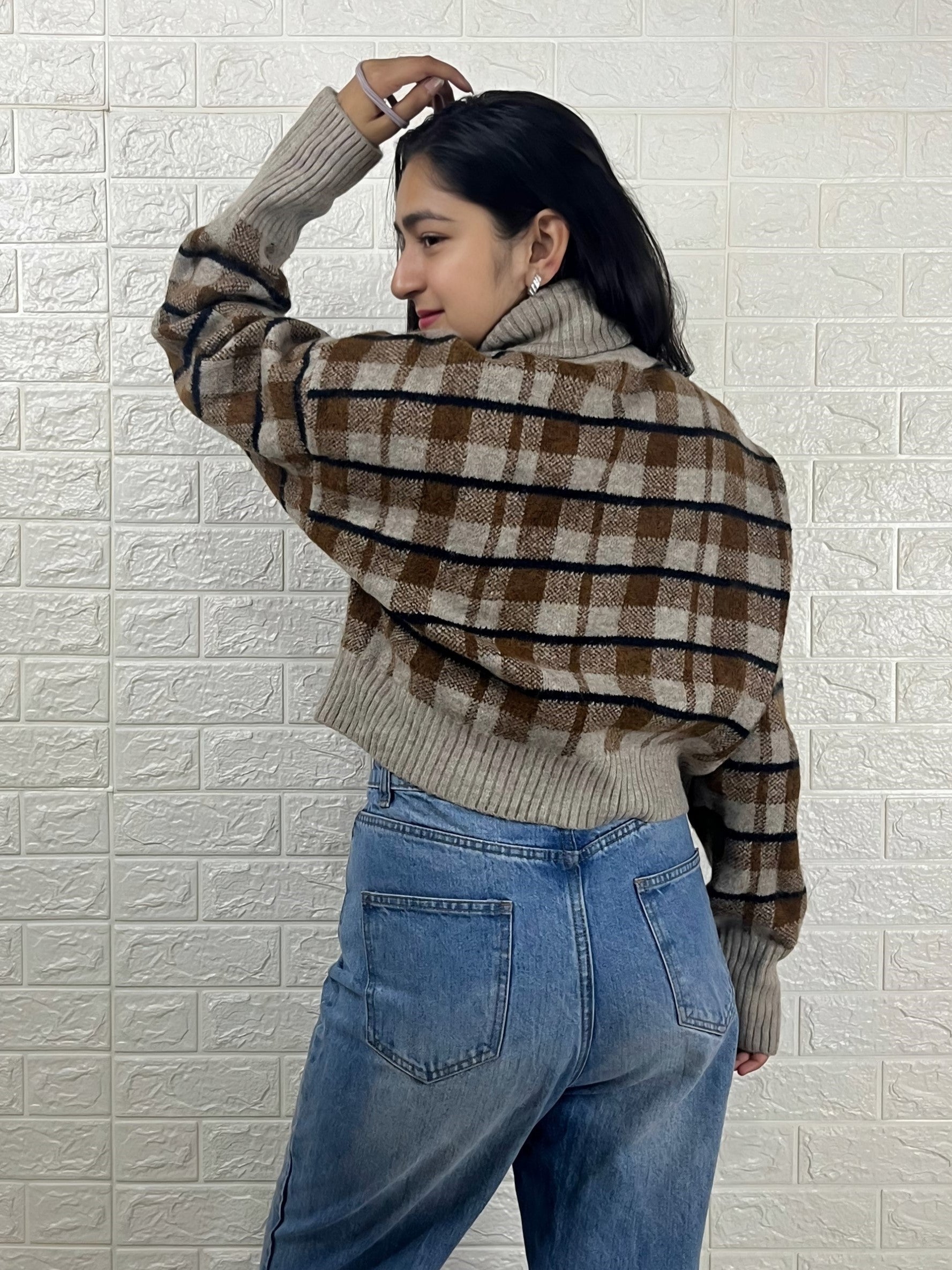 Stay warm and stylish this winter with this women’s turtleneck checked sweater, designed to blend comfort with timeless charm. Featuring a brown and beige checkered pattern accented with black highlights, this pullover adds a classic, sophisticated touch to your wardrobe. Crafted from premium soft knitted fabric, it comes with a cozy high-neck design for added warmth and a trendy winter-ready look. The full sleeves, ribbed cuffs, and ribbed hemline ensure a snug, comfortable fit—perfect for wearing solo or layering on colder days. Its relaxed yet polished silhouette makes it an ideal choice for casual outings, college, office wear, or everyday winter styling.