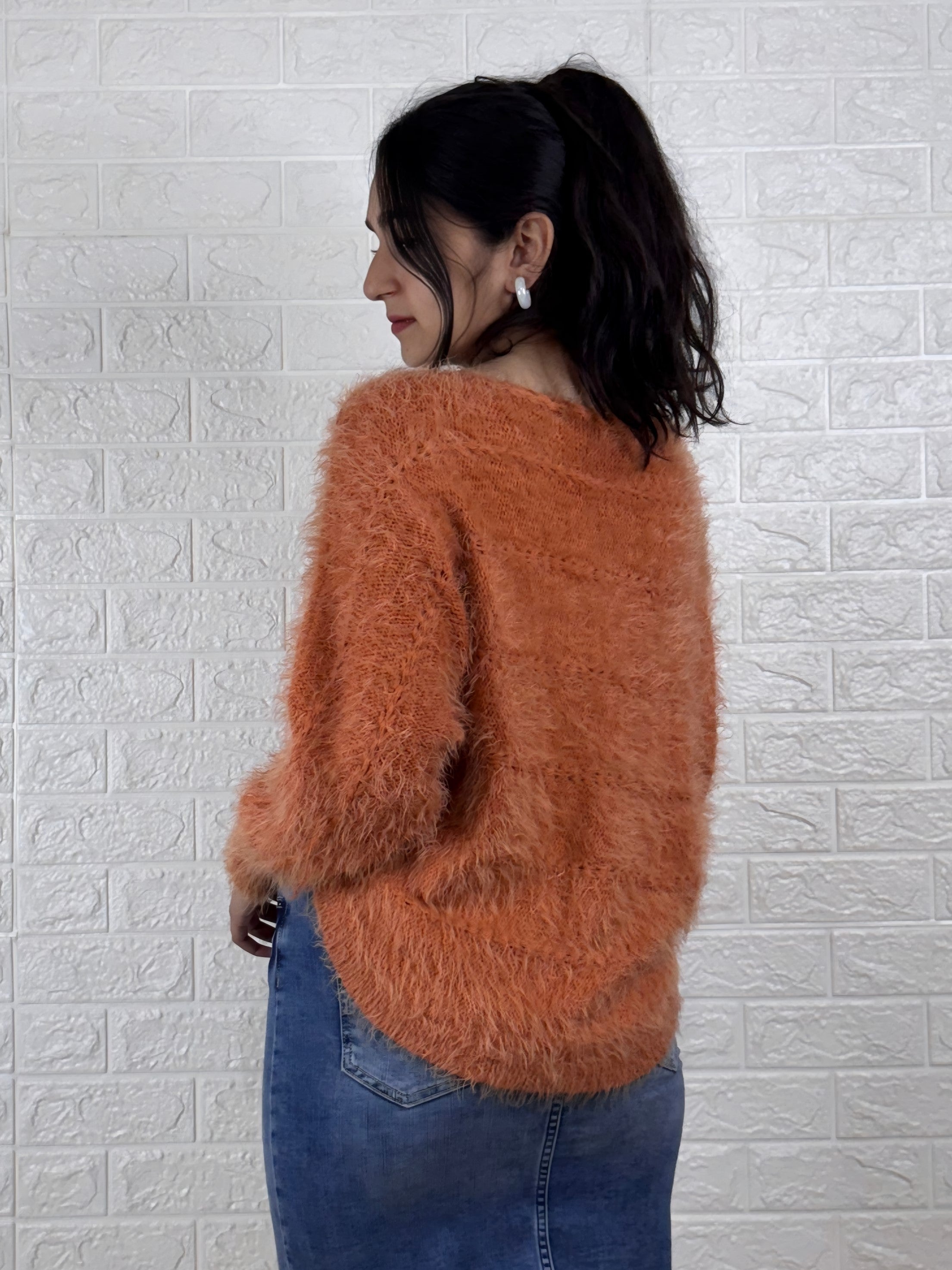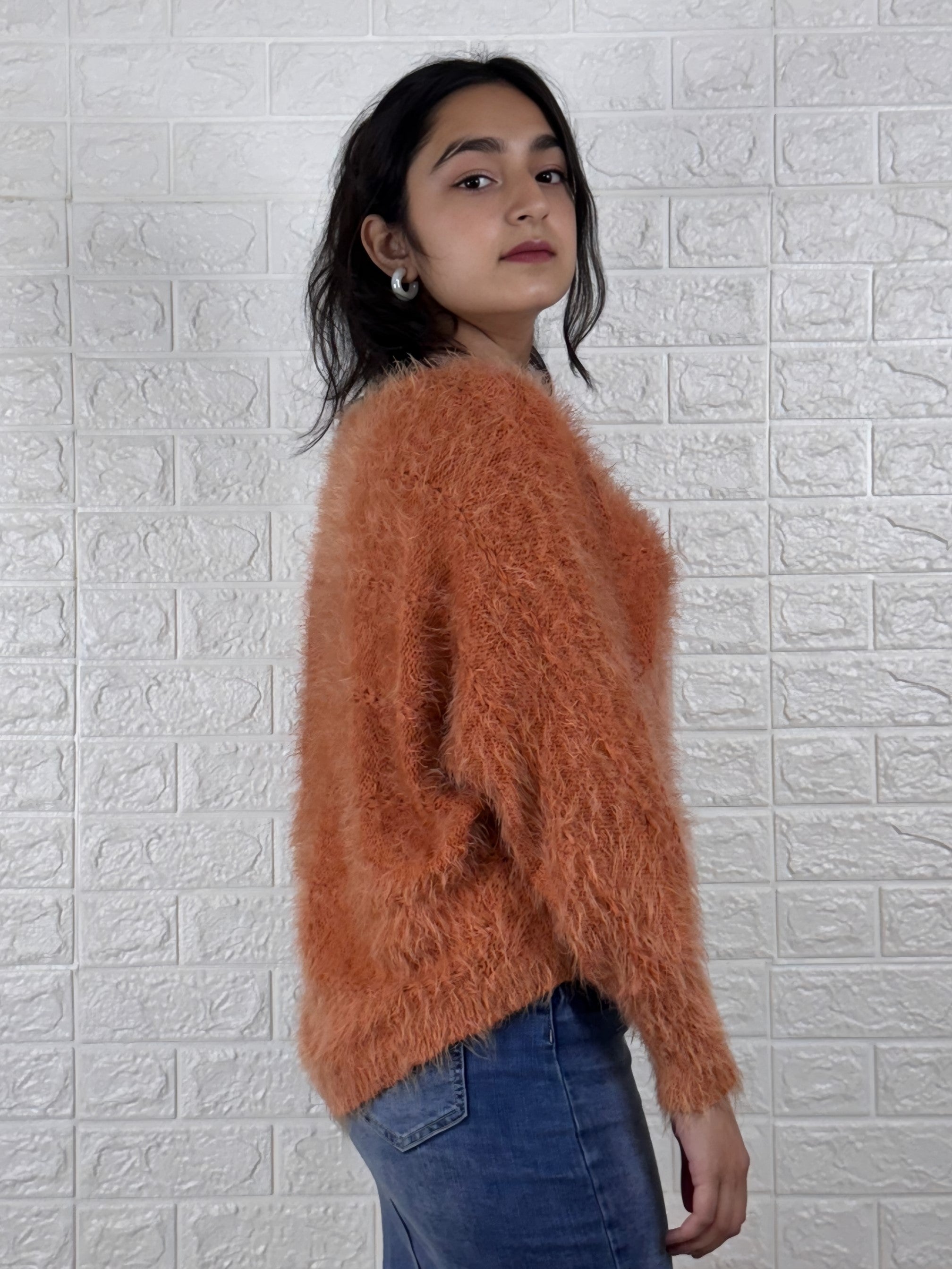 Stay cozy and stylish with this women’s fuzzy knitted sweater in a vibrant orange shade. Crafted from ultra-soft fluffy yarn, this pullover delivers warmth with a lightweight, breathable feel—perfect for chilly days. Designed with a wide boat neckline and full sleeves, it offers a relaxed, trendy silhouette. The fuzzy textured knit adds a playful yet elegant touch, making it a must-have for winter fashion lovers.